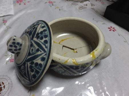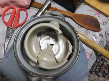 石鹸でも、土鍋を温めても、トントントンと、軽く叩いても、1時間ぐらい頑張ったのだけど、小鉢や土鍋に傷が付くだけで、どうにもならない。入れる時には、全く普通に入ったのに、何故取り出せなくなってしまったのか、不思議だ!!そのままではらちがあかないので、意を決して、どちらかを割る事にした。高価なのは小鉢の方なのだが、利用頻度では、そんなに高価なものではないのだが土鍋の方だ。・・という事で、泣く泣く小鉢を金槌で割る事にした。(写真B)割ってしまった小鉢だが、どうも、捨てるのにもしのびなく、なんとも割り切れないので、ボンドでくっつけて土を入れて、花を入れる事にした。勿体無いのでね。これも執着・・・!